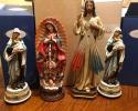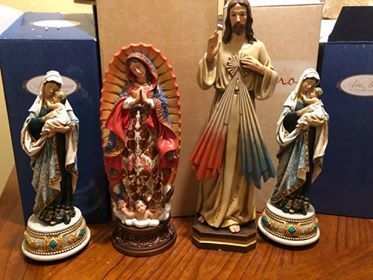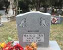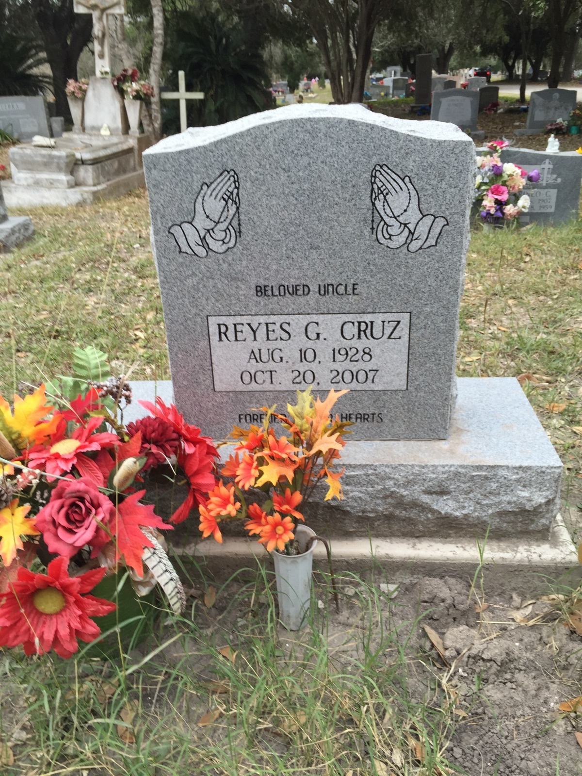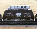 This is Georgia gray stone with Black litho chrome letters.The design is pair of praying hands with rosaries. The names and dates are encased with a square frosted panel.
